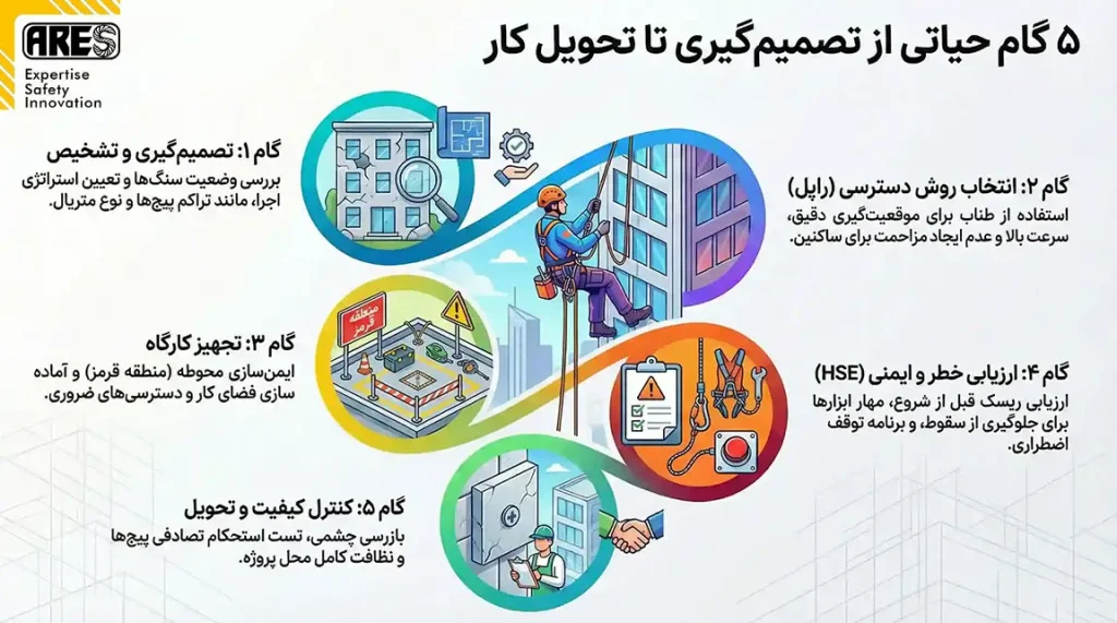 پس از تصمیمگیری، نوبت به انتخاب روش دسترسی میرسد. چرا در متدولوژی مدرن، “راپل” (کار با طناب) جایگزین داربست شده است؟